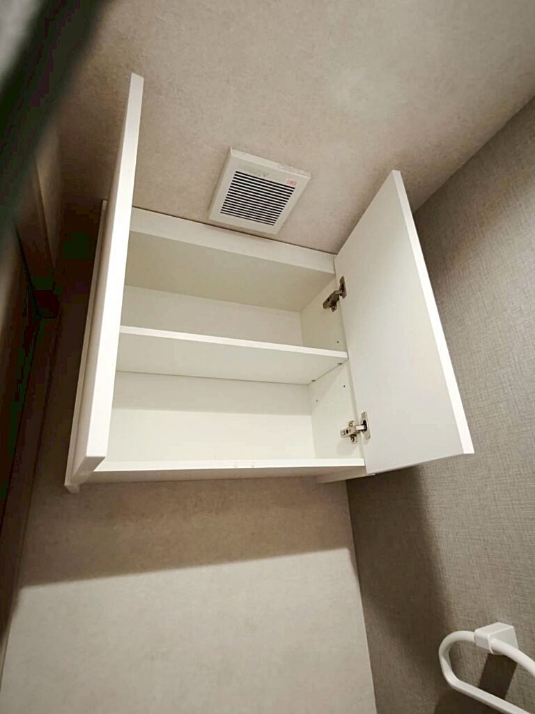 ■収納■ 三面鏡の中(ミラーキャビネット) とボール下に スライドタイプの収納があり、ワンランク上のデザイン。