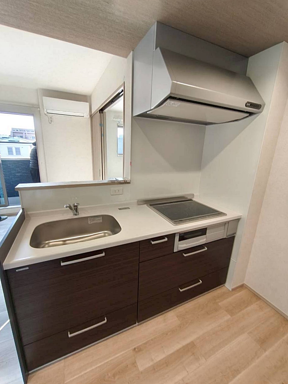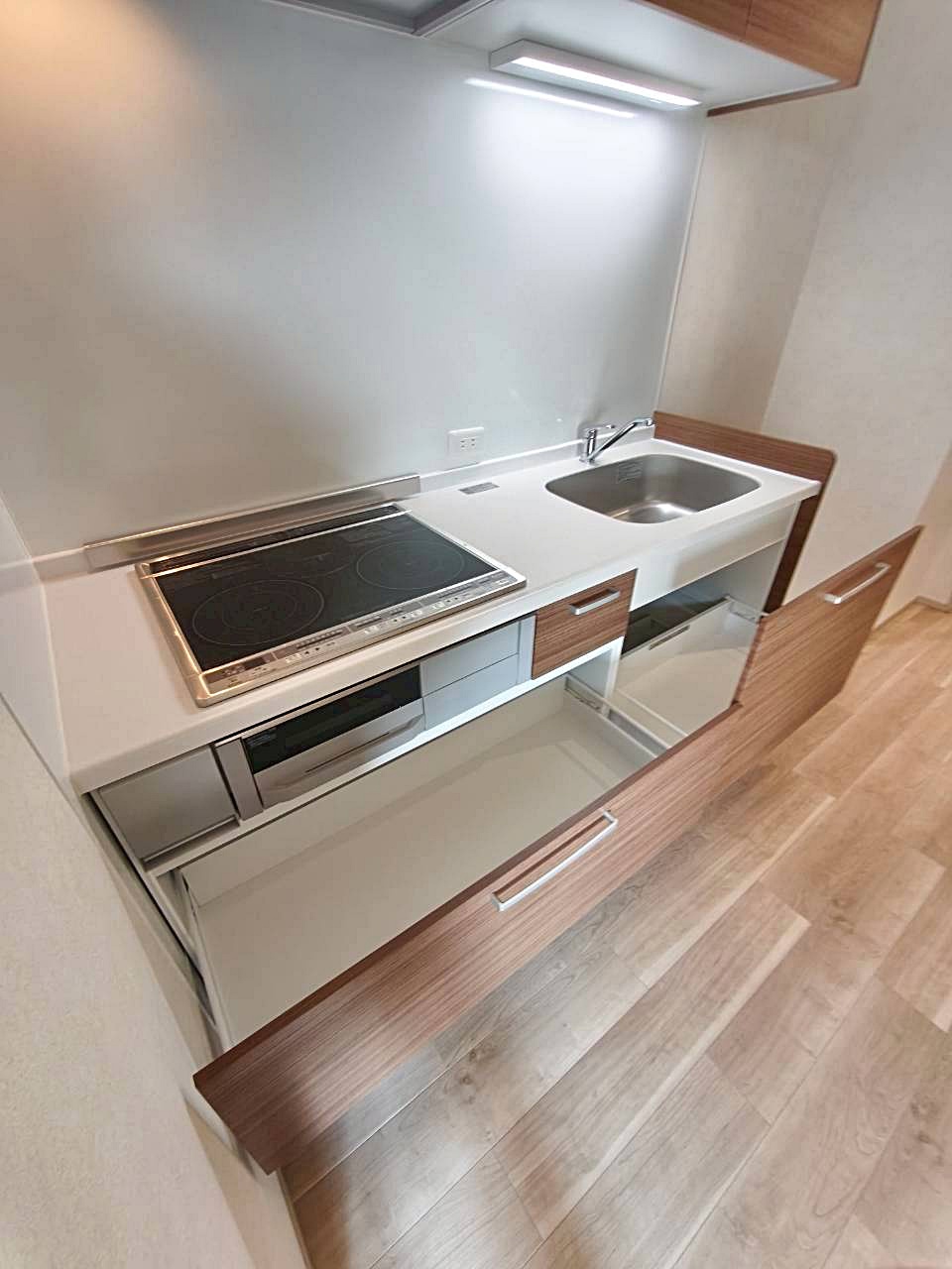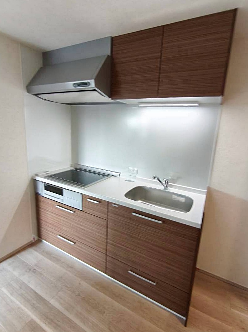 ▷壁付けタイプのキッチンは吊戸棚に手元灯設置=103/203/303号室